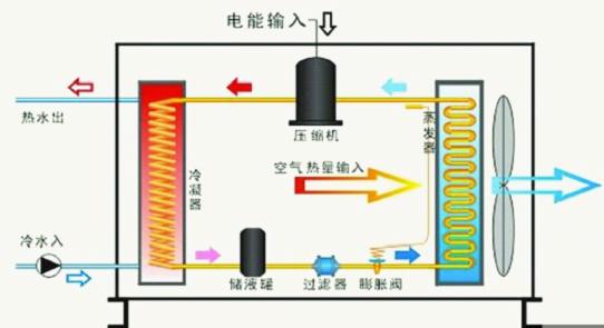 利用空气能热泵系统内密闭工质(冷媒)的物理特性,通过工质的物态变化,蒸发器从空气中吸取热量,冷凝器在水中释放热量。即压缩机从蒸发器中吸入低温低压气体制冷剂,通过做功将制冷剂压缩成高温高压气体,高温高压气体进入冷凝器与水进行热量交换,制冷剂在冷凝器中冷凝成低温高压液体而放出大量的热量,水吸收其放出的热量而温度不断上升。然后低温高压液体经膨胀阀节流降压后,在蒸发器中通过风扇的作用蒸发,吸收周围空气中的热量,制冷剂变成低温低压气体后又被吸入压缩机中压缩。如此周而复始,使空气中的热量源源不断地传递到水中,从而制取热水。由于压缩机每消耗一份电能,就能促进制冷剂传递2~6份热能,所以它比传统热水器更加高效节能。